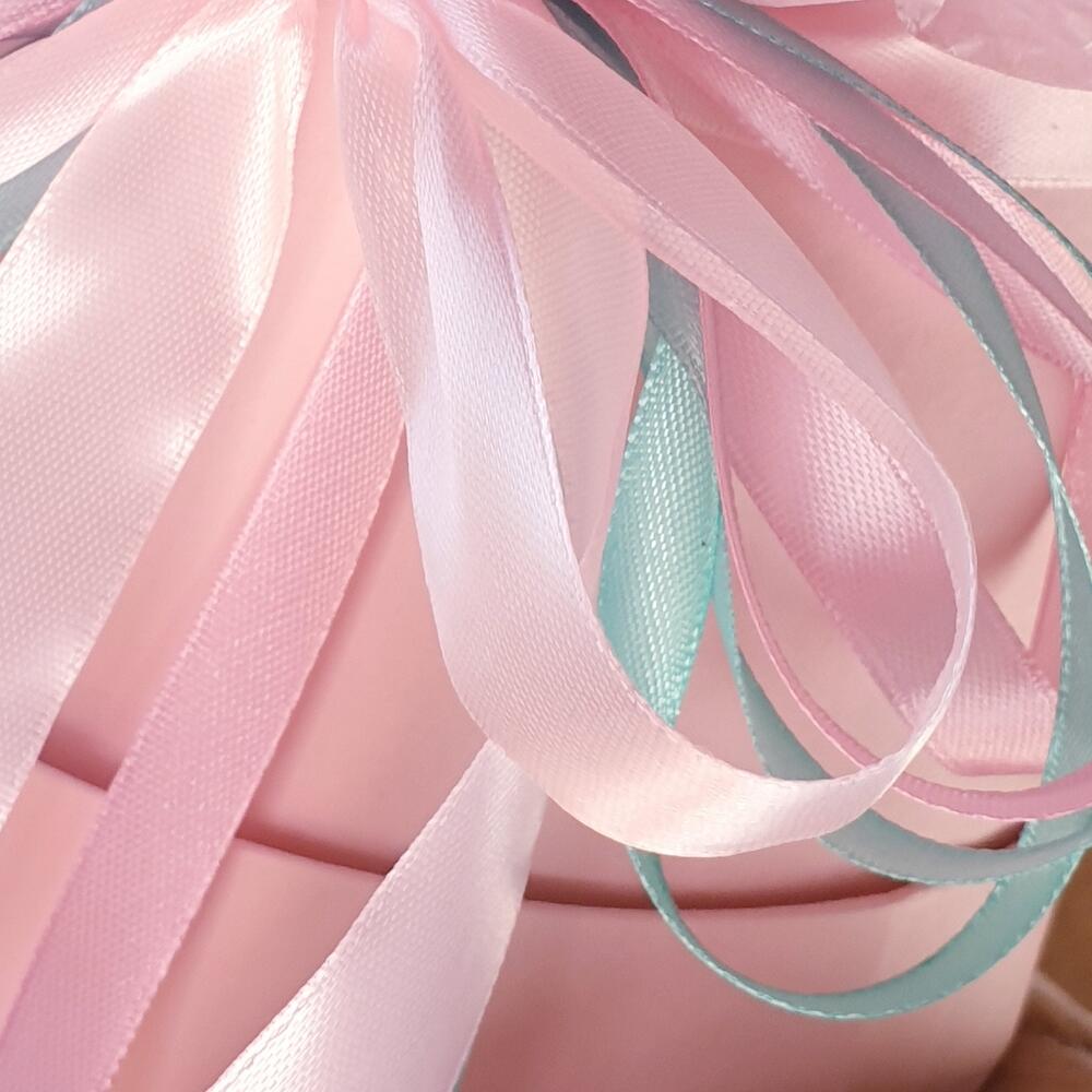 Лента атласная – 3 шт.Открыточка с вашими пожеланиями – 1 шт.Оазис флористический – 1 шт.Коробка шляпная розовая – 1 шт.гипсофила радужная – 7 шт.
