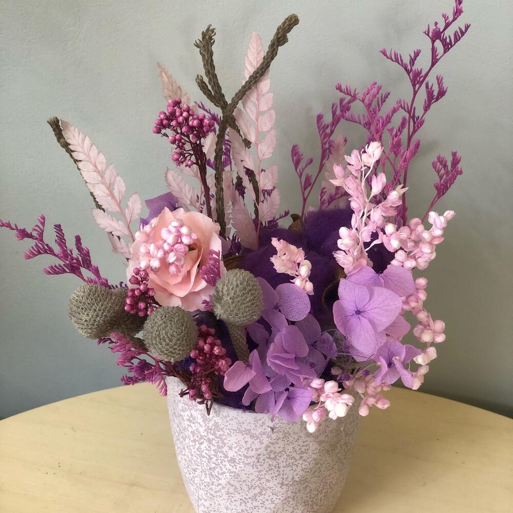 Керамическое кашпо – 1 шт.Гортензия – 1 шт.Папоротник – 1 шт.Бруния – 1 шт.Лимониум – 1 шт.