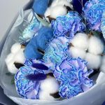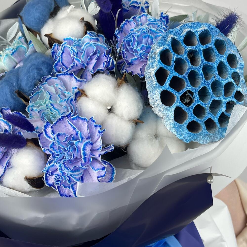 Букет с синими диантусами и лотосом