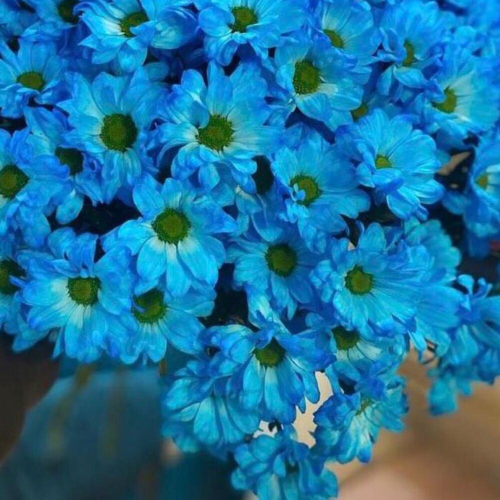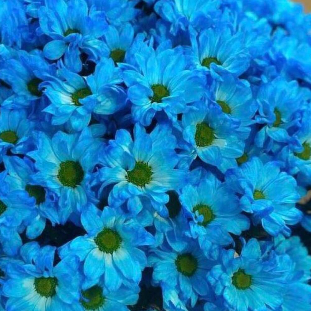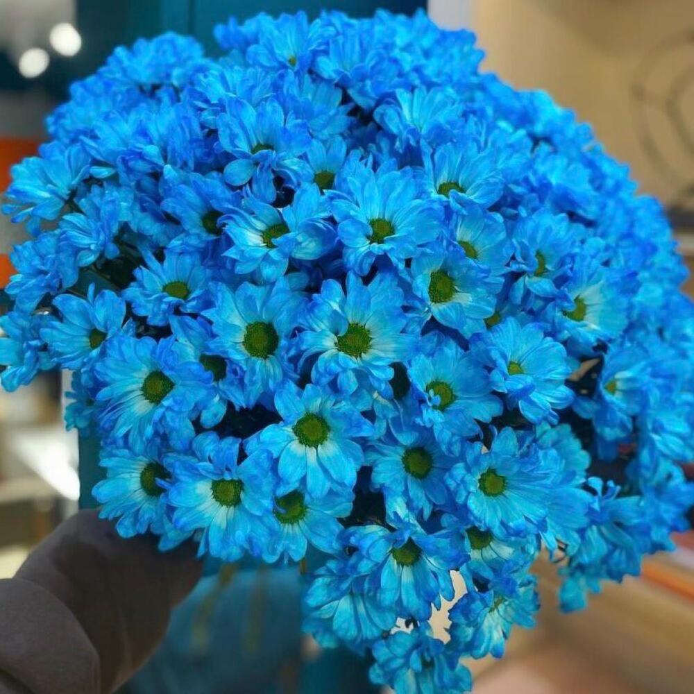 Хризантема голубая – 29 шт.Лента атласная – 2 шт.Открыточка с вашими пожеланиями – 1 шт.хорошее настроение – 100 шт.инструкция по уходу за цветами – 1 шт.коробка переноска – 1 шт.Кризал – 1 шт.