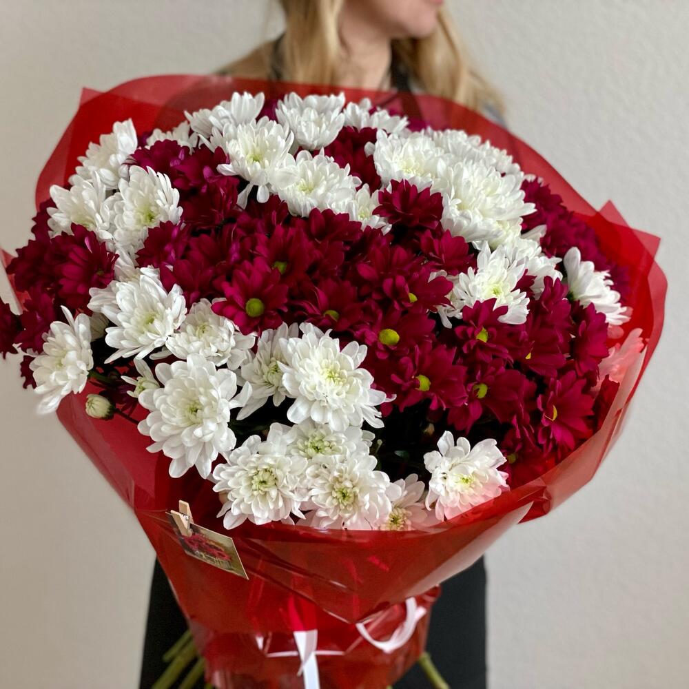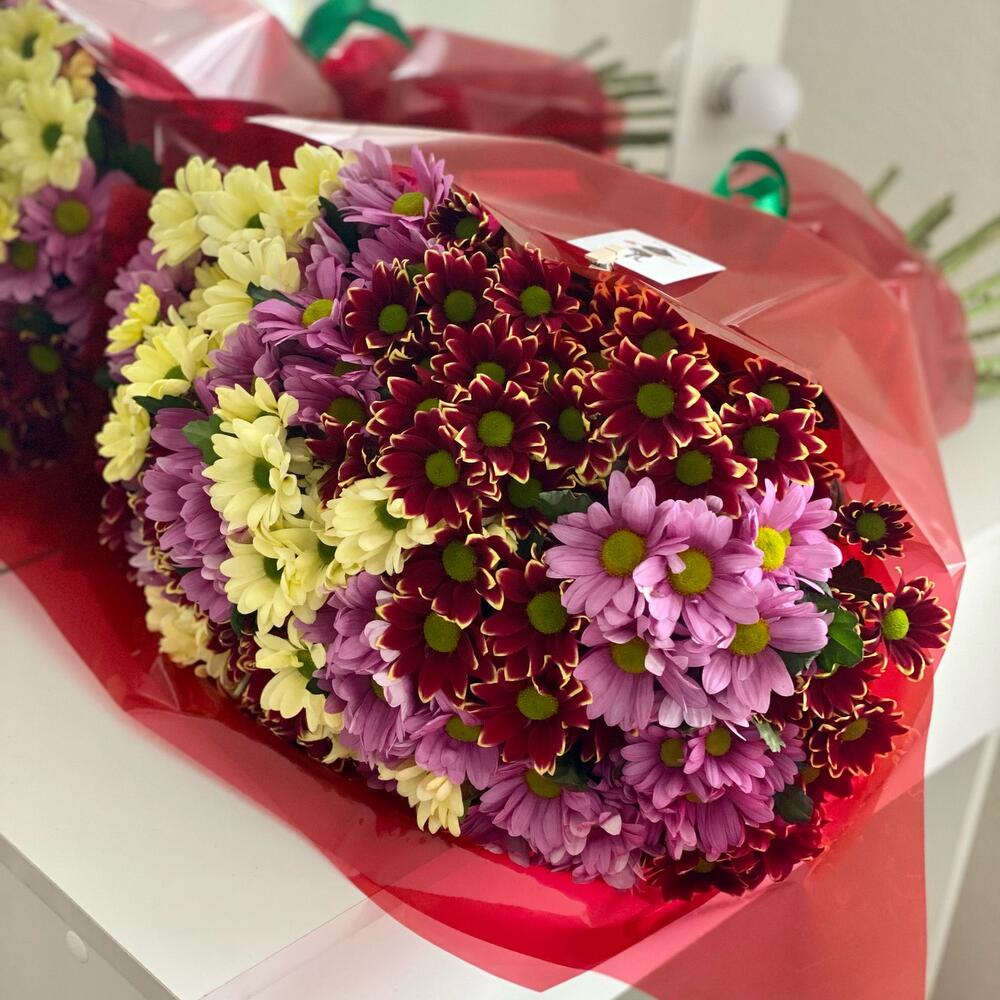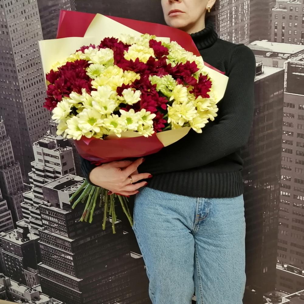 Лента – 1 шт.Упаковка дизайнерская – 1 шт.Хризантема кустовая микс – 25 шт.