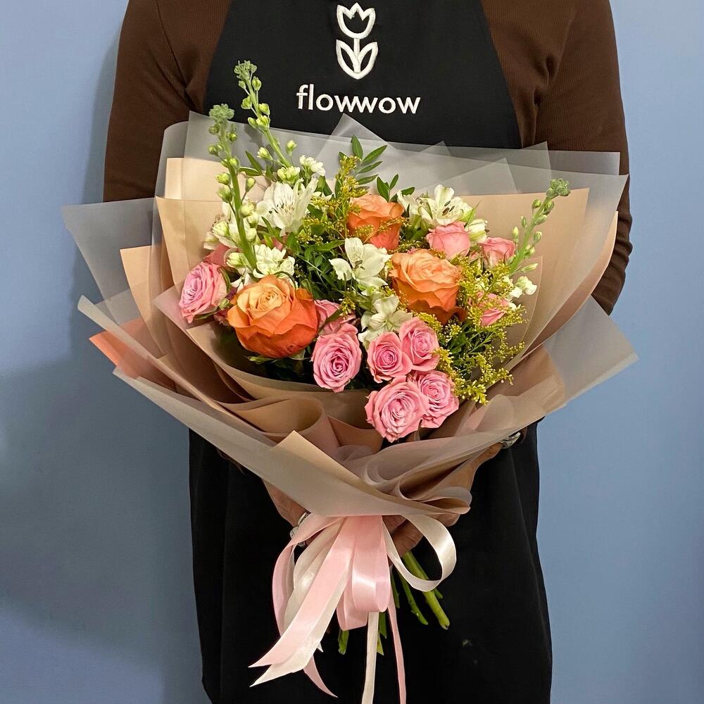 Альстромерия – 3 шт.Солидаго – 2 шт.Кустовая роза – 3 шт.Лента атласная – 2 шт.Фисташка – 3 шт.Упаковка дизайнерская – 2 шт.Маттиола белая – 3 шт.пионовидная роза премиум – 3 шт.