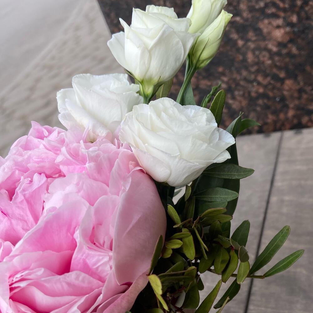 Лизиантус – 1 шт.Пион – 1 шт.Фисташка – 1 шт.Оазис флористический – 1 шт.Стакан крафт дизайнерский – 1 шт.