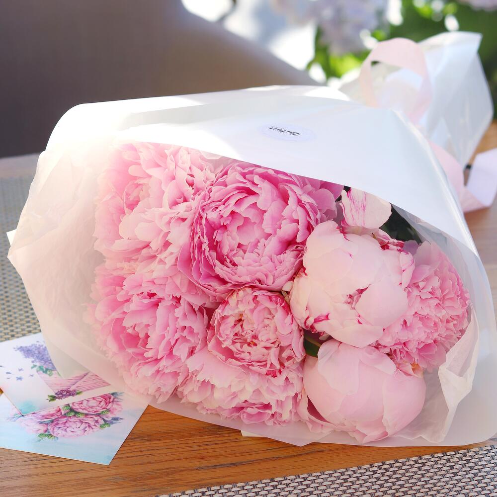 Пион розовый – 9 шт.Подкормка – 1 шт.Открыточка с вашими пожеланиями – 1 шт.Шоколадка – 1 шт.Дизайнерская упаковка – 1 шт.инструкция по уходу за цветами – 1 шт.