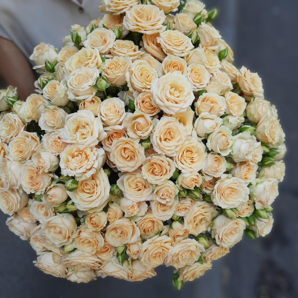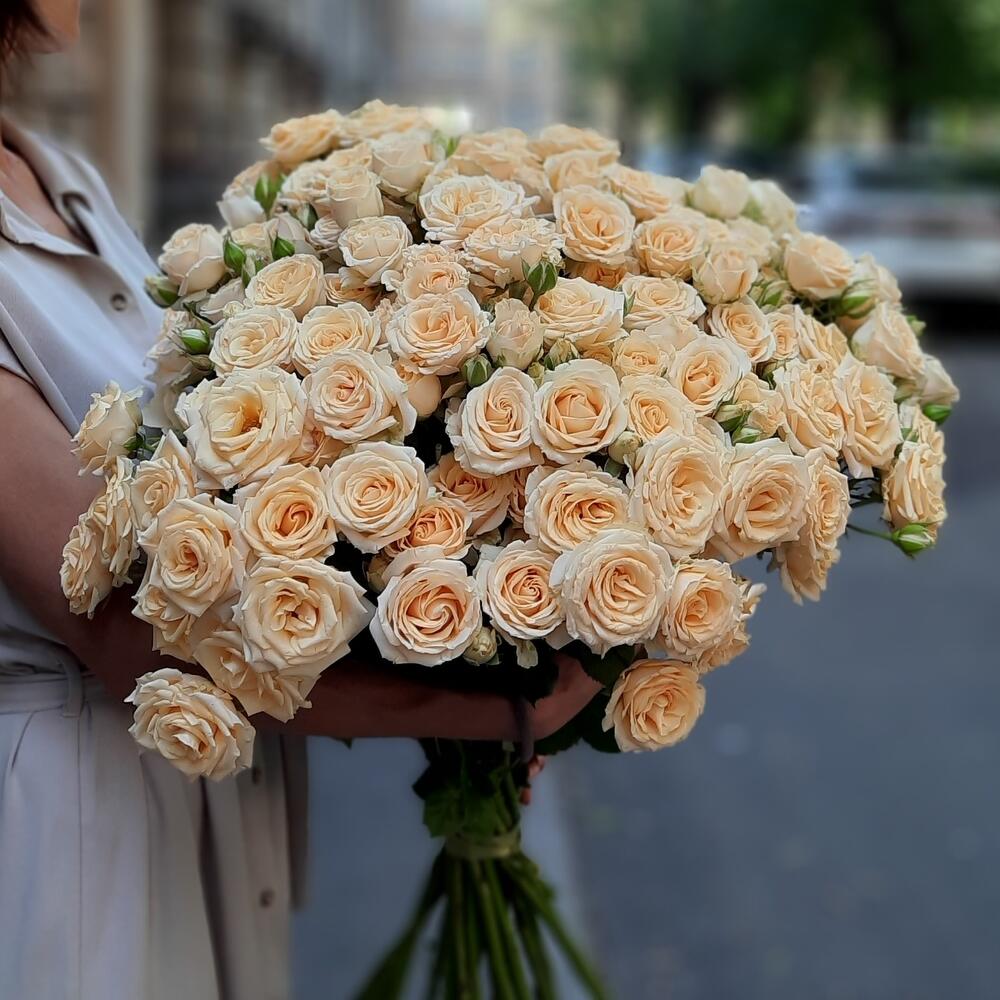 роза кустовая кремовая 60 см – 25 шт.упаковка дизайнерская в подарок – 2 шт.Лента органза – 1 шт.