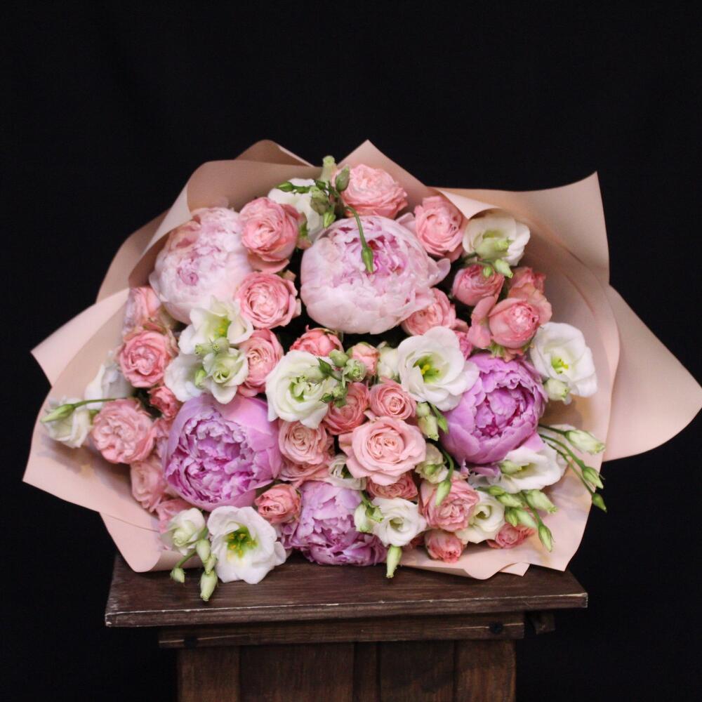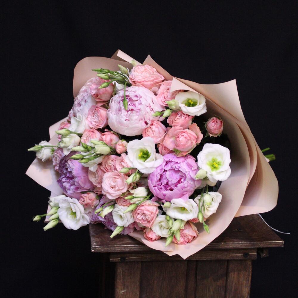 Лента атласная – 1 шт.Пион Сара Бернар – 5 шт.эустома белая – 5 шт.Роза кустовая пионовидная мадам бомбастик – 7 шт.Пленка дизайнерская – 2 шт.