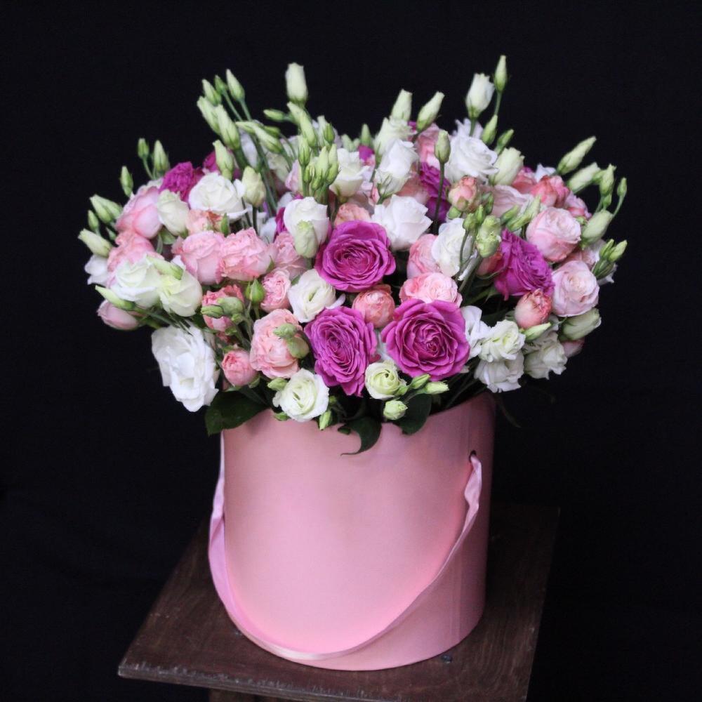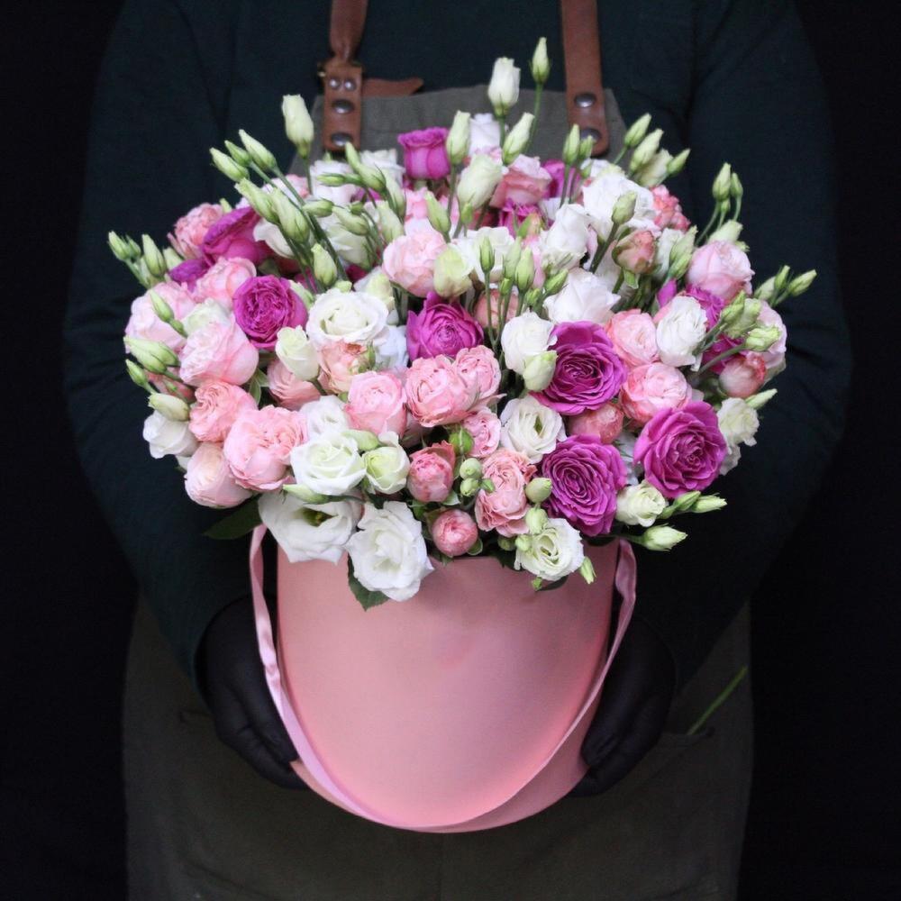 Роза кустовая пионовидная мадам бомбастик – 10 шт.роза кустовая пионовидная классик сенсейшн – 5 шт.Эустома – 10 шт.Оазис флористический – 1 шт.Шляпная коробка – 1 шт.
