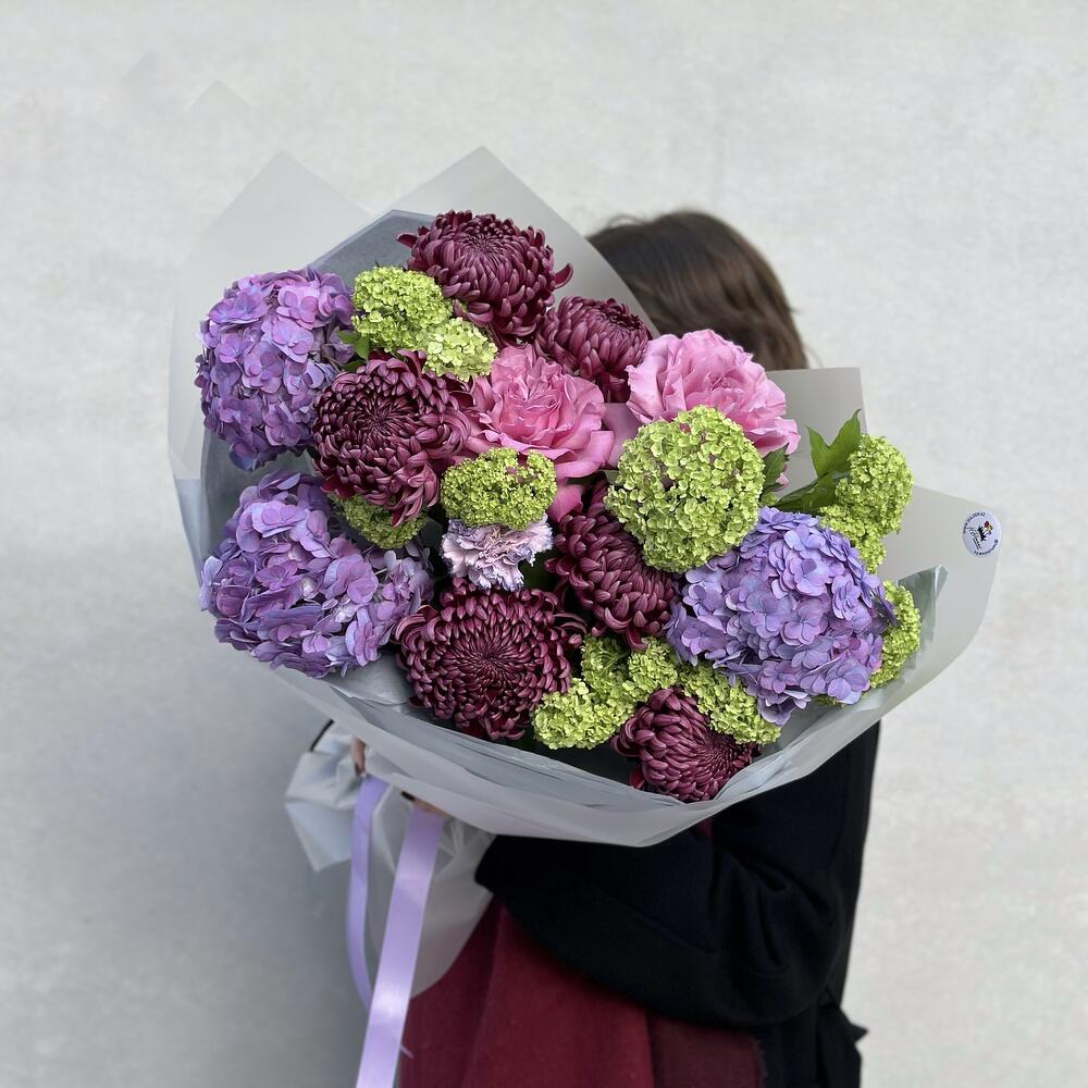 Гортензия – 3 шт. Хризантема одноголовая – 6 шт. Роза – 2 шт. Вибурнум – 4 шт. Гвоздика – 1 шт.