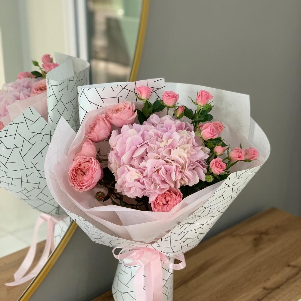 Альстромерии, Гортензии, Кустовые розы, Лизиантусы, Розы, Хризантемы