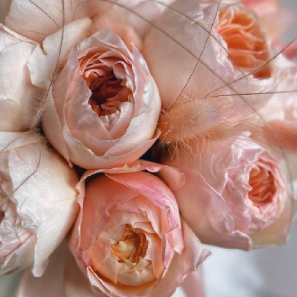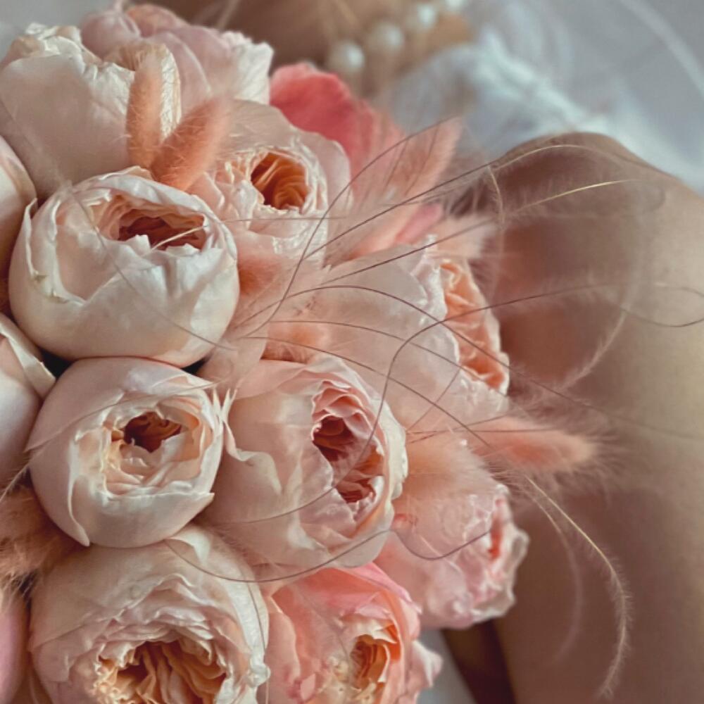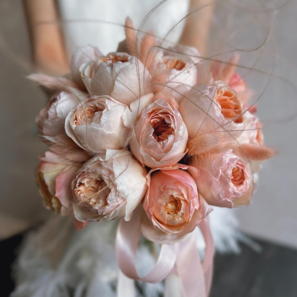 Пионовидная роза – 15 шт.Атласная лента – 1 шт.Лагурус (сухоцвет) – 12 шт.пучок сухоцветов – 5 шт.