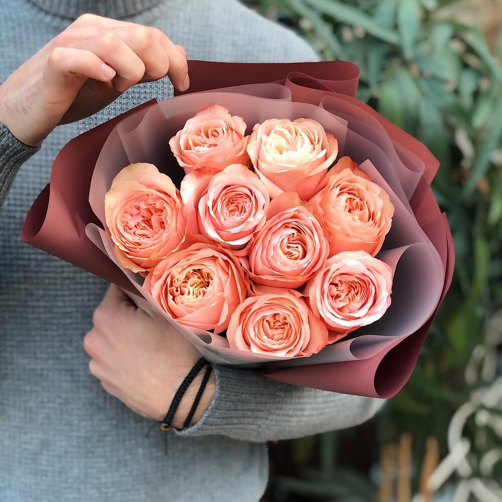 Пленка матовая – 4 шт. Пионовидная роза персиковая – 9 шт.