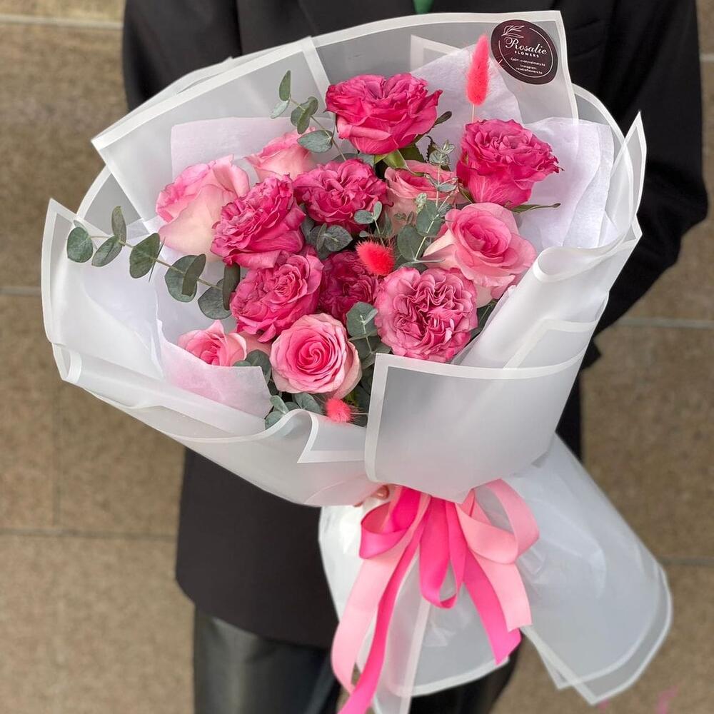 Гвоздики, Кустовые розы, Лизиантусы, Пионовидные розы, Розы