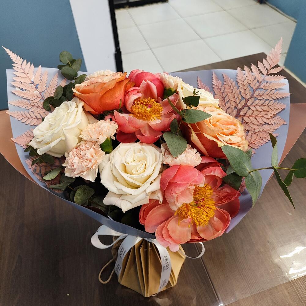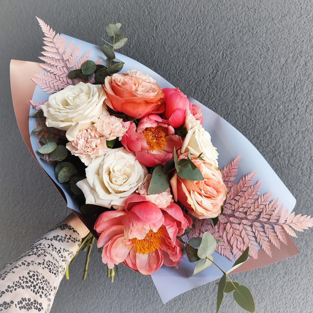 Пион Коралл Шарм (Coral Charm) – 3 шт.роза плая бланка – 3 шт.Роза кахала – 2 шт.Диантус премиум – 5 шт.Эвкалипт – 2 шт.Сухоцветы – 2 шт.Авторская упаковка – 1 шт.Атласная лента – 1 шт.