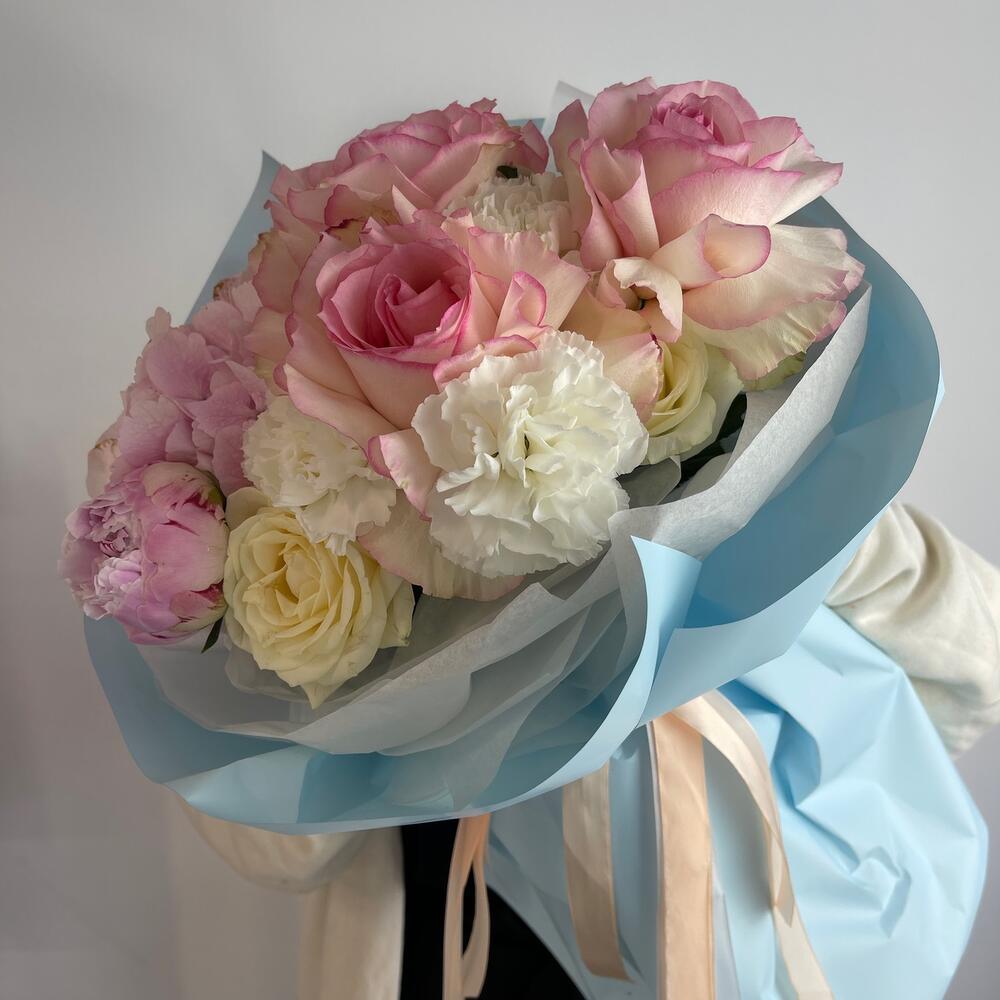 Букет с пионовидными тюльпанами,пионовидной розой и пионами