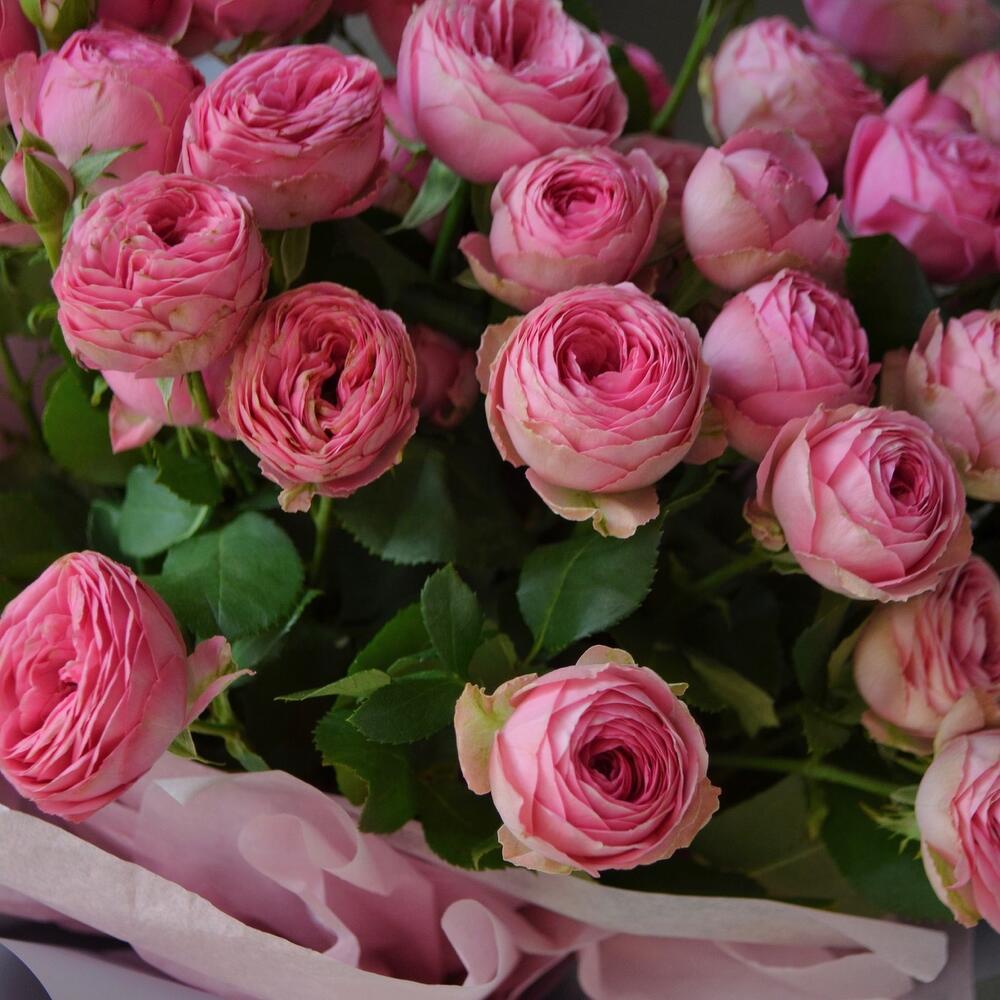Букет из 9 кустовых пионовидных роз сорта Giselle, упаковка, атласная лента.