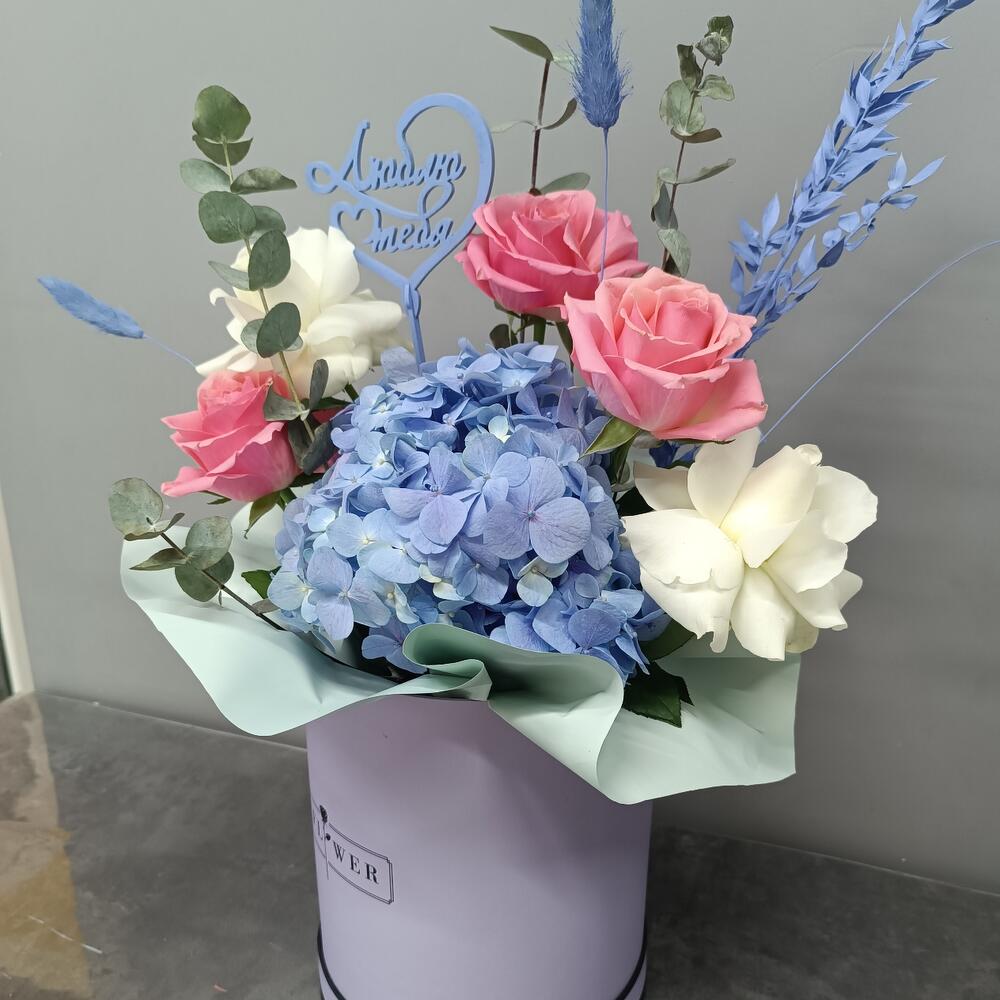 Гортензия – 1 шт. Сухоцветы – 1 шт. Открыточка с вашими пожеланиями – 1 шт. Голландская роза – 5 шт. Эвкалипт – 4 шт.