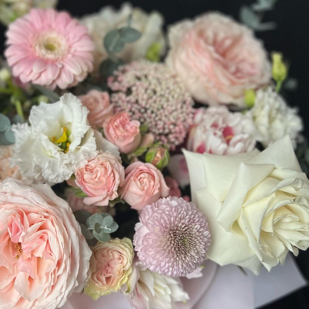Пионовидная роза – 5 шт.Кустовая роза – 3 шт.Тюльпан пионовидный – 3 шт.Хризантема – 2 шт.Гербера – 3 шт.Лизиантус – 4 шт.Озотамнус – 2 шт.антиринум – 2 шт.Эвкалипт – 3 шт.Шляпная коробка – 1 шт.Флористическая губка (оазис) – 1 шт.Атласная лента – 1 шт.