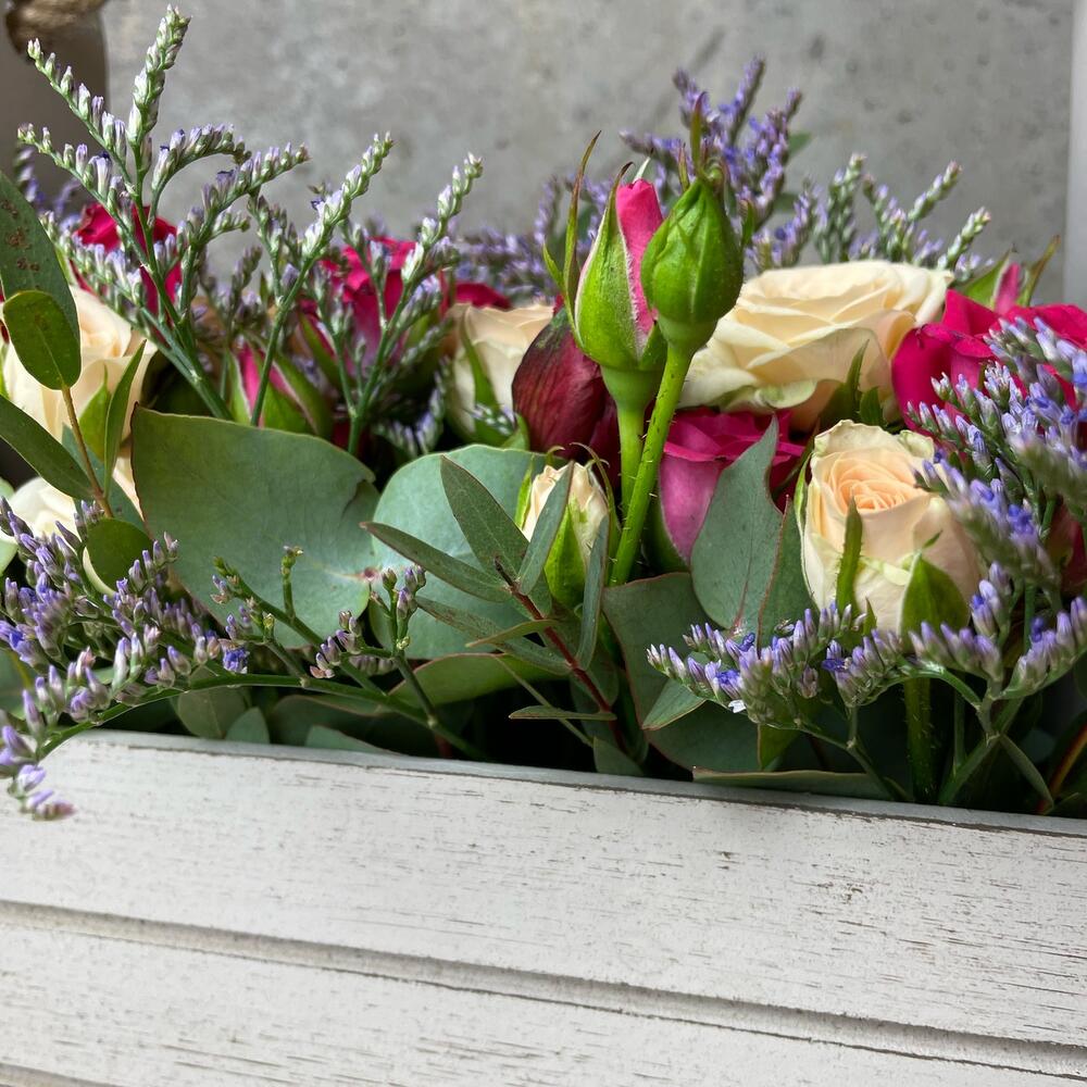 Роза кустовая – 7 шт.Эвкалипт – 3 шт.Лимониум – 3 шт.Губка флористическая – 1 шт.Ящик деревянный – 1 шт.