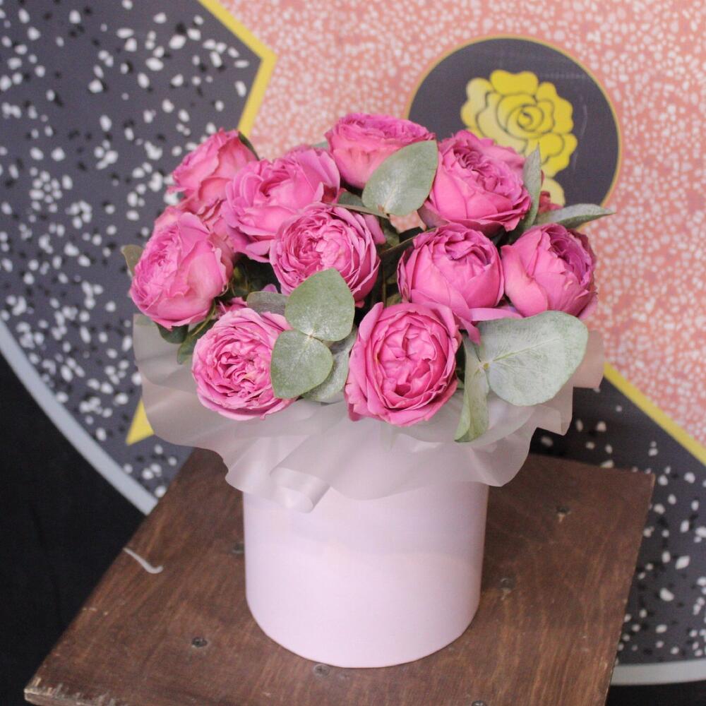 Эвкалипт – 2 шт.Коробка шляпная – 1 шт.Оазис флористический – 1 шт.Пленка дизайнерская – 1 шт.роза кустовая пионовидная мисти бабл – 7 шт.