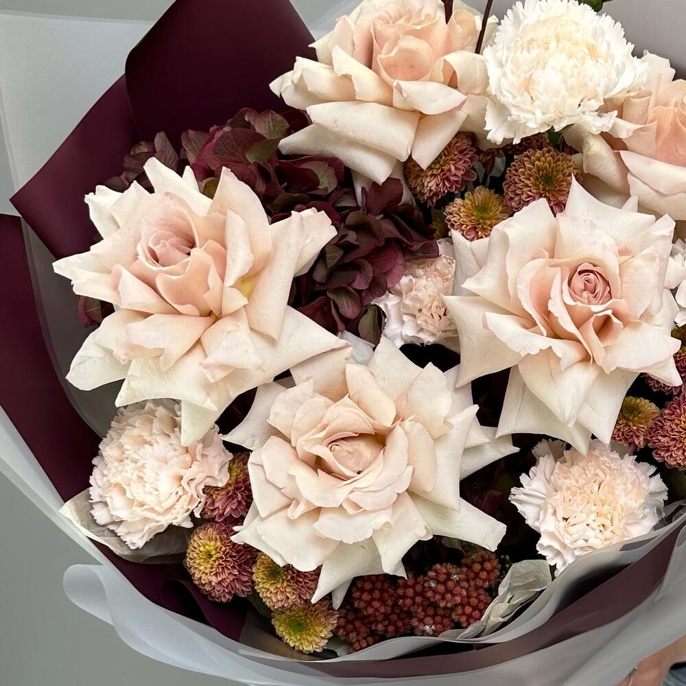 Альстромерии, Гортензии, Кустовые розы, Лизиантусы, Розы, Хризантемы