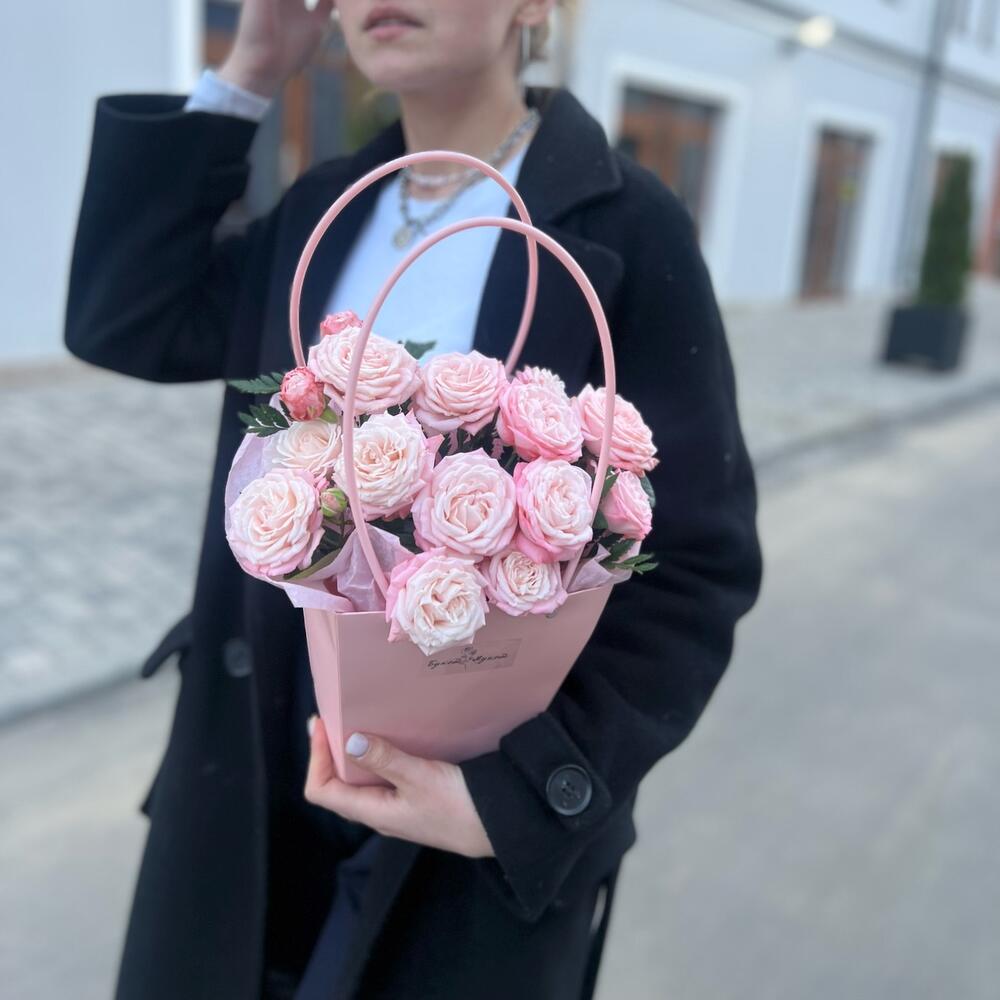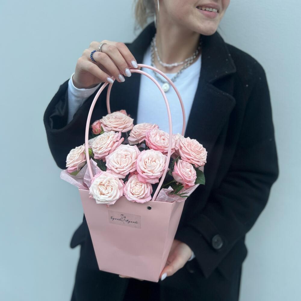 Роза кустовая Бомбастик – 4 шт.Тишью – 2 шт.Оазис флористический – 1 шт.сумочка с ручками – 1 шт.