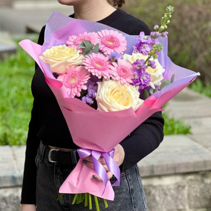 Статица – 1 шт.Эвкалипт – 2 шт.Лента атласная – 1 шт.Роза пионовидная – 3 шт.Упаковка дизайнерская – 2 шт.маттиола сиреневая ароматная – 2 шт.розовая гербера мини – 5 шт.