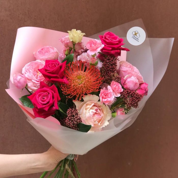 Скиммия – 1 шт.роза сильва пинк пионовидная – 2 шт.Лизиантус – 1 шт.Гвоздика кустовая – 2 шт.Нутан – 1 шт.Роза Шангрила – 3 шт.Роза Кейра пионовидная – 1 шт.Упаковка – 1 шт.