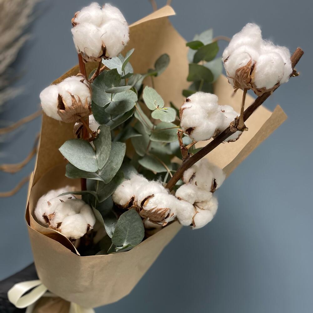 Хлопок (сухоцвет) – 2 шт.Эвкалипт – 4 шт.Упаковка дизайнерская – 1 шт.