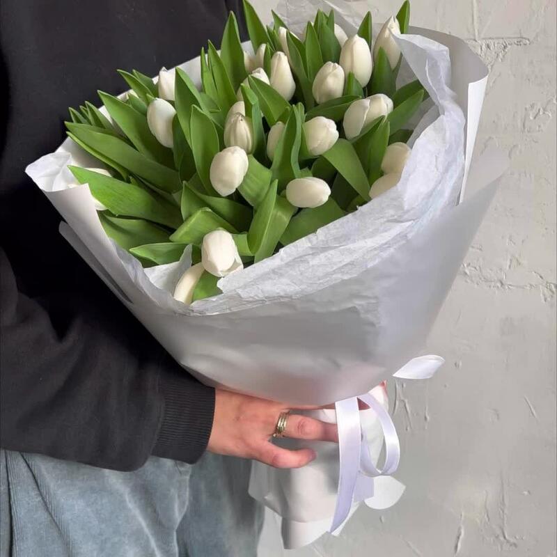 Лента атласная – 2 шт.Упаковка дизайнерская – 3 шт.Тюльпан белый – 29 шт.